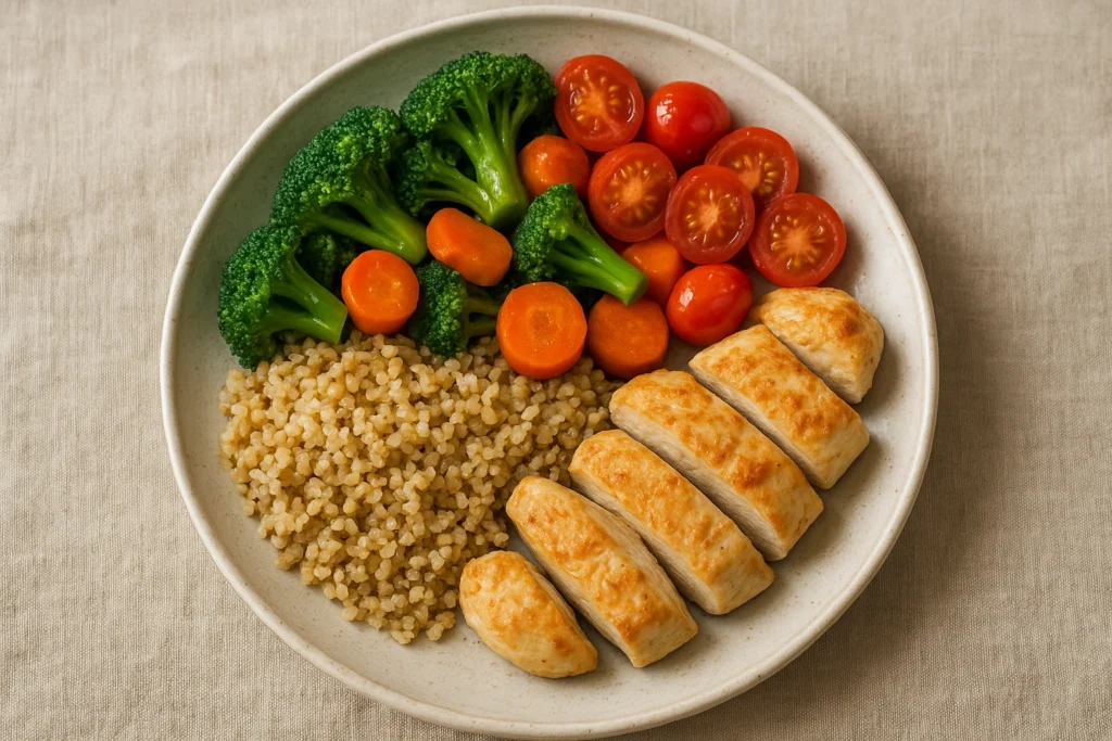 Nahaufnahme (Top-down) einer ausgewogenen Tellerportion: Hälfte buntes Gemüse (gedünsteter Brokkoli, Karotten, Tomaten), ein Viertel Vollkornreis/Quinoa, ein Viertel mageres Protein (Hühnchen oder Tofu). Keramik-Teller auf Leinen-Tischdecke, natürliche, neutrale Tageslichtfarbe, hohe Detailauflösung, geringe Tiefenschärfe am Rand, realistische Texturen und satte, aber natürliche Farben, fotorealistisch.